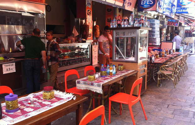 Unos largos toldos azules cubren las calles pasadas por alto por las tiendas, tratando de ofrecer un poco de sombra y refugio contra el calor. El bazar de Esmirna ocupa toda la parte central de la ciudad y ofrece vistas al mar. La calle principal del mercado es Anafartalar Caddesi.