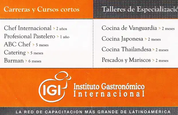 En el IGI - INSTITUTO GASTRONÓMICO INTERNACIONAL, se pueden estudiar las siguientes Carreras: Profesional Gastronómico - Profesional Pastelero - Profesional Sommelier.-